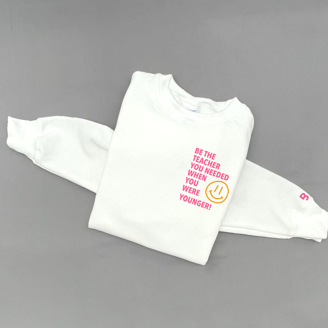 Made for the ones who show up with heart, this everyday tee is a tribute to the teachers who lead with intention. Featuring the phrase “Be the teacher you needed when you were younger” subtly printed on the front left chest, it’s a quiet reminder of your purpose—and the impact you’re making every single day.